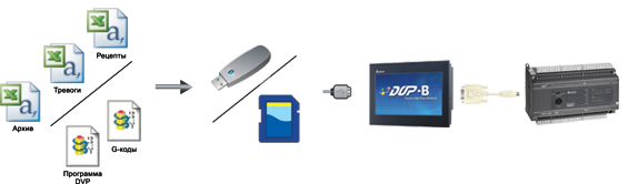 Гибкий интерфейс хранения данных. Поддержка SD-карт памяти (вкл. SDHC) SD и USB флеш карты позволяют копировать и переносить программу панели, данные буферов архива и тревог, могут расширить память данных панели для хранения архива и рецептов. Прикладная программа для ПЛК и G-коды для DVP-PM могут быть записаны на SD/USB карту, и затем загружены в ПЛК через панель оператора, что очень удобно, потому что не требует подключения к компьютеру.