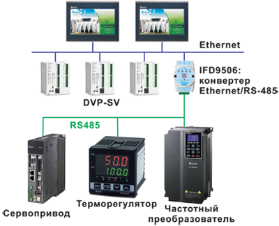 Лучшее решение для сетевой диспетчеризации Используя Ethernet, можно легко реализовать сеть типа N:N с несколькими ведущими станциями. Устройства не имеющие Ethernet порта (сервоприводы, частотные преобразователи, регуляторы температуры, и др.) можно подключить через конвертер IFD9506, и, тем самым, создать сеть, охватывающую все продукты промышленной автоматизации Delta.
