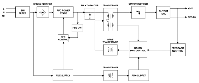 Для примера представлена блок-схема DRP024V480W1AA (24 В, 480 Вт, 1 фаза)