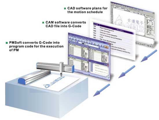 Ещё одной интересной особенностью является поддержка компиляции проектов систем проектирования CAD в формат G-code с последующей загрузкой в контроллер DVP-PM для управления движением по 2-м осям с линейной или круговой интерполяцией, например, в машинах с числовым программным управлением.
