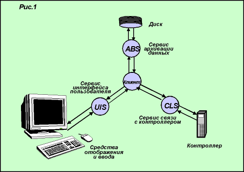 В программной системе станции оперативного сбора данных и управления можно выделить 3 основных типа сервисов: сервис связи с контроллером - Controller Link Service (CLS), сервис интерфейса пользователя - User Interface Service (UIS) и сервис архивов истории и протоколов событий - Archive Base Service (ABS). Ресурсом для CLS является канал связи с контроллером, для UIS - устройства ввода и визуализации, для ABS - диски и тому подобное.