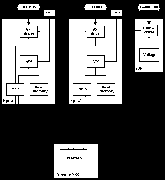 Таким образом, система включает в себя 4 компьютера объединенные сетью Ethernet: 2 VXI контроллера , 286 компьютер с адаптером ISA-CAMAC и консоль, с которой осуществляется общее управление системой. Все модули VXI и большая часть модулей CAMAC разработаны и изготовлены в ПИЯФ.