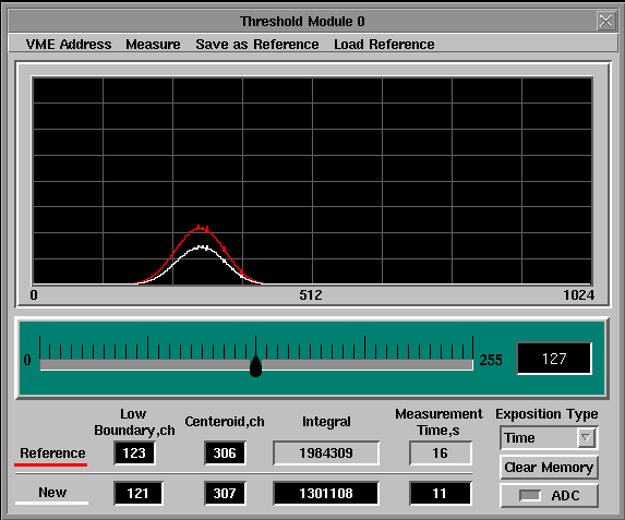 Вторая подсистема - 20-ти канальный позиционно-чувствительный детектор, выполнена в стандарте VME. Счетчики собраны по 4 в модуле. Для настройки счетных каналов в каждом модуле есть один АЦП и память объемом 4096 16-разрядных слов (8kb) . Так как АЦП один на каждые четыре канала, каналы в одном модуле можно настраивать только последовательно, а не одновременно как в системе DEUTON. Все модули VME собраны в одном крейте. Окно программы, позволяющее производить настройку каналов приведено на рис. 5. Все модули и адаптеры системы разработаны и изготовлены в ПИЯФ.