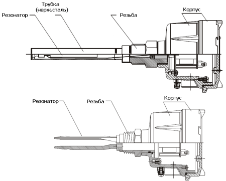 В основе принципа действия таких датчиков лежит использование двух пьезоэлектрических элементов, встроенных в резонаторную систему в виде трубки или вилки-камертона. Один пьезоэлемент возбуждает в резонаторной системе сильные механические колебания вплоть до наступления резонанса. Контакт чувствительного элемента с контролируемой средой вызывает резкое уменьшение амплитуды колебаний вплоть до их полного гашения. Такая смена состояний улавливается вторым пьезоэлементом, сигнал преобразуется схемой управления, и срабатывает релейный выход датчика.