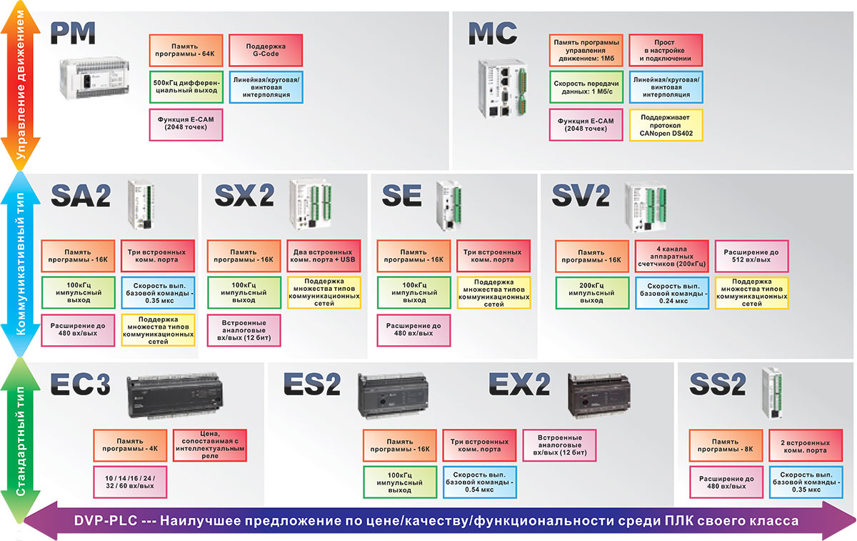 В настоящее время семейство DVP объединяет в своем составе 9 типов базовых модулей, широкий спектр модулей ввода/вывода, коммуникационных модулей и плат расширения.