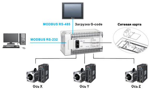 Для загрузки G-кодов используются сенсорные панели оператора типа DOP-B07PS415/515 * аналогичными по функциям являются модули движения для контроллеров семейства AH500: AH05PM-5A/AH10PM-5A/AH15PM-5A