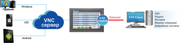 • FTP сервер Каждая панель является FTP сервером, которым можно управлять для загрузки PDF файлов, рецептов, журналом операций, историей и аварийными сигналами через Ethernet