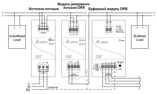 Режим резервирования осуществляется через модуль DRR. Реализуется путем подключения двух источников питания, как показано на схеме, и источник большей мощности возьмет на себя всю нагрузку. Другой источник будет находиться в резерве. >>>