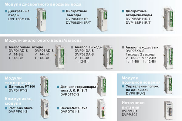 Модули аналогового ввода/вывода,температурные, модуль DIP-переключателей, комуникационные: Profibus/DeviceNet , модуль позиционирования.