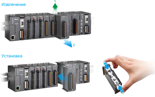 Легкая замена модулей Упрощает обслуживание системы при выходе из строя одного модуля - его можно заменить не раздвигая сборки и не осуществляя перемонтаж проводов.