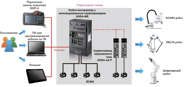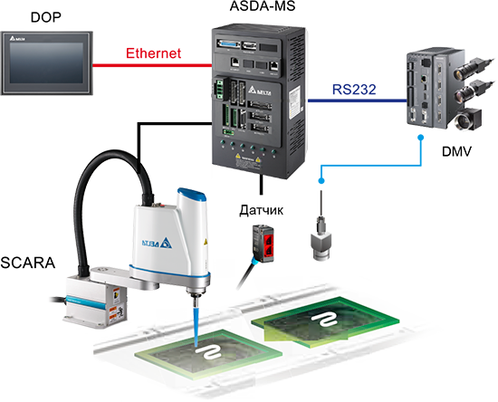 • Имеет инструменты для реализации требуемых функций и поддерживает разные типы роботов, такие как 4-х осевой SCARA робот, робот Delta с линейными или поворотными приводами и 6-и осевой артикуляционный робот с 2-мя осями по DMCNET, позволяя создавать гибкие и надежные решения