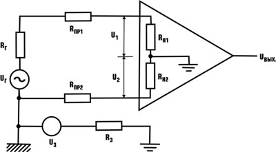 Первые два члена в правой части уравнения представляют собой напряжения шумов, а третий член – напряжение полезного сигнала. Если IШ1 равен IШ2 и RH1 равно RН2, то напряжение шумов на нагрузке равно нулю. Уравнение при этом упрощается: