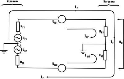 При симметрировании источника относительно земли (рис. 2) получается полностью симметричная система. В общем случае последовательно с проводниками оказываются включенными два синфазных напряжения шумов Uш1 и Uш2, которые вызывают появление токов шумов IШ1 и IШ2. Источники UГ1 и UГ2 совместно создают сигнальный ток Iг. При этом суммарное напряжение на нагрузке составит