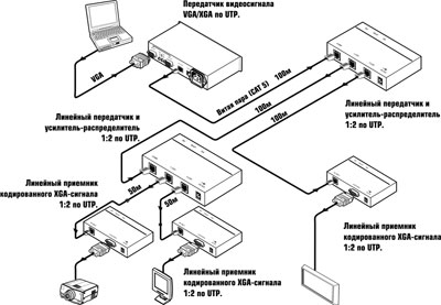 • Сигналы класса VGA можно передавать на расстояния до 100-300 метров. Пример системы передачи такого сигнала на 100 м приведен на рисунке 3, а разветвленной системы распределения сигнала до 250 м — на рисунке 4. Рисунок 4 Распределение VGA/XGA-сигнала от одного источника на много удаленных дисплеев