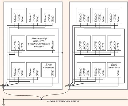 - Аналоговую, цифровую и силовую землю системы соединяйте только в одной точке. Если этого сделать невозможно, используйте медную шину с большой площадью поперечного сечения для уменьшения сопротивления между разными точками подключения земель