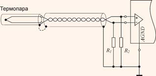 Вывод AGND модуля ввода сигналов термопар не соединён с землёй. Условно показанный разрыв в изображении модуля символизирует гальваническую развязку между его частями. Аналоговая часть модуля имеет эквивалентную ёмкость на землю Сплав, которая включает в себя ёмкость входных цепей на землю, ёмкость проводников печатной платы на землю, проходную ёмкость DC/DC преобразователя и оптронов гальванической развязки.