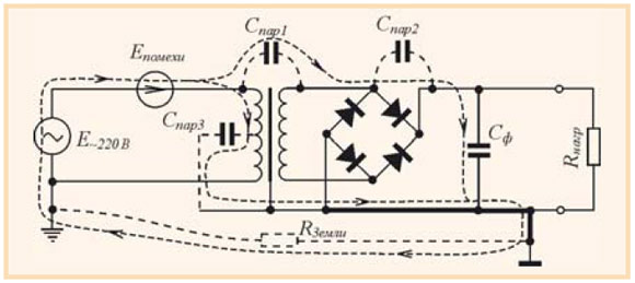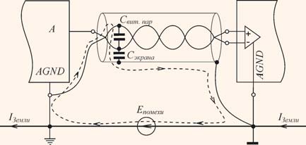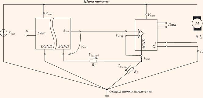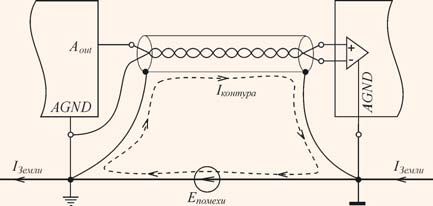 Таким образом, шина земли является в общем случае "грязной" землёй, источником помех, имеет активное и индуктивное сопротивление. Она является эквипотенциальной только с точки зрения защиты от поражения электрическим током, но не с точки зрения передачи сигнала. Поэтому если в контур, включающий источник и приёмник сигнала, входит участок "грязной" земли то напряжение помехи будет складываться с напряжением источника сигнала и прикладываться ко входу приёмника (см. раздел "Кондуктивные наводки").