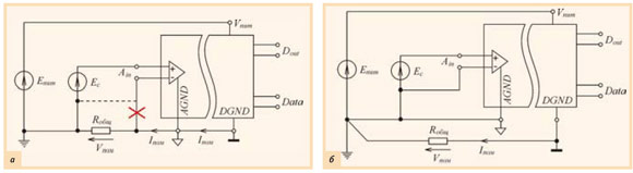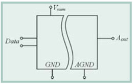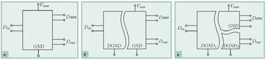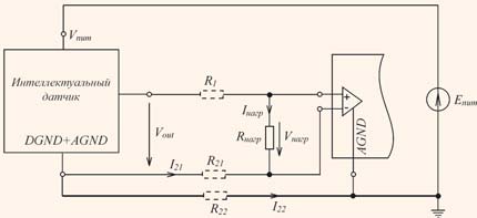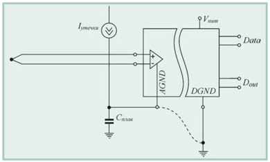 AGND — аналоговая земля; DGND — цифровая земля; Data — информационный порт модуля (вход/выход данных); Dout — дискретный выход; Сплав — эквивалентная ёмкость на землю; Iутечки — ток утечки; Vпит — клемма подключения источника питания.