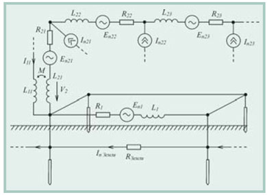 Каждый участок проводника (шины) системы заземления имеет индуктивность Lij, сопротивление Rij, и в нём наводится эдс Eij путём электромагнитной индукции. На разных участках шины заземления к ней подсоединено оборудование системы автоматизации, которое поставляет в шину заземления ток помехи In21... In23, вызванный описываемыми в разделе "Источники помех на шине земли" причинами, и ток питания, возвращающийся к источнику питания по шине земли.