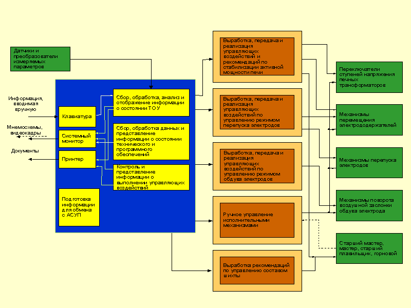 В состав системы входят подсистемы: информационная; управления электрическим режимом; управления режимом спекания и перепуска электродов; управления шихтовым режимом.