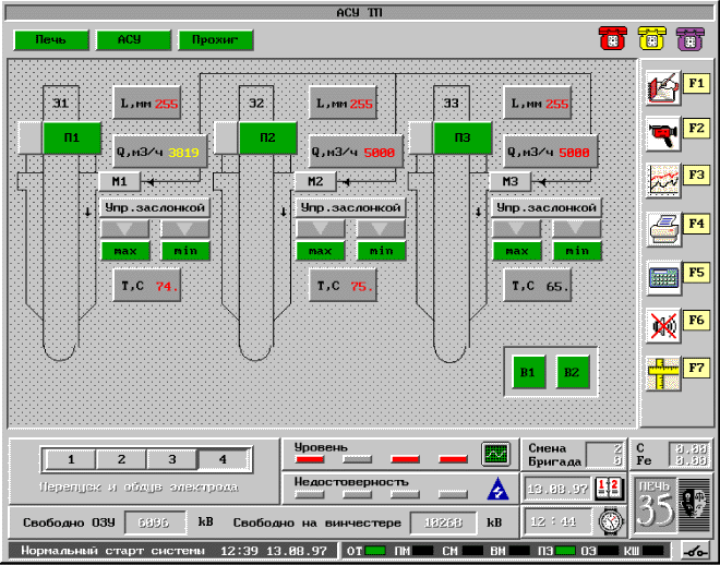 Система введена в эксплуатацию в январе 1995г. и работает круглосуточно. Основными воздействиями окружающей среды являются : мощные электромагнитные поля от электрической дуги и от печных трансформаторов, температура, запыленность. Особенно следует отметить устойчивую работу монитора рабочей станции IPC-820 в условиях мощных электромагнитных помех. За все время работы был только один выход из строя платы вывода дискретных сигналов PCL-720, связанный с тем ,что при ее обслуживании в цепи 24В ошибочно включили источник напряжения 220 В. Низкое качество питающего напряжения один раз в 2-3 дня приводит к тому, что система перезапускается. Перезапуск не приводит к фатальному результату, т.к. при этом обеспечивается сохранение необходимой информации и выполнение всех функций системы