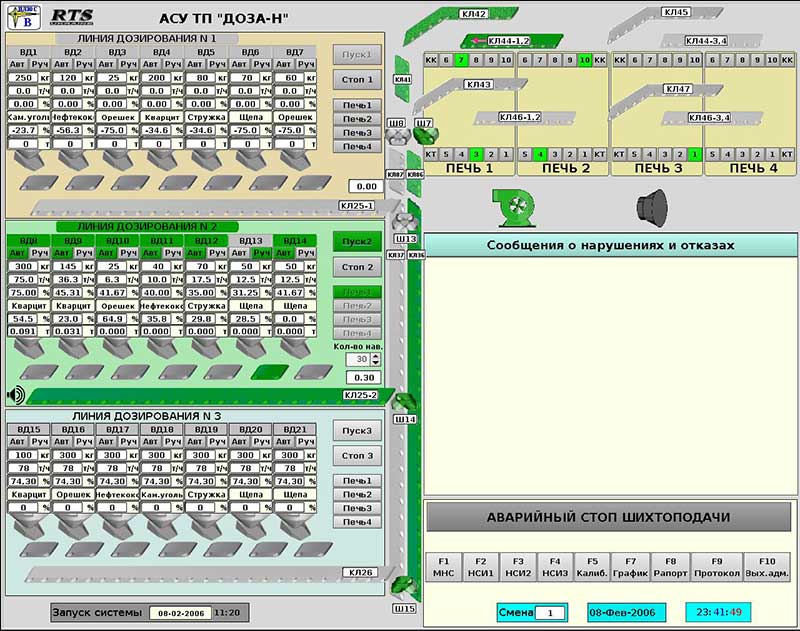 Информационная подсистема обеспечивает сбор данных, архивацию и отображение состояние оборудования трех линий дозирования, поточно- транспортной системы и печных бункеров 4-х рудотермических электропечей:
