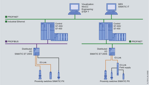 С помощью распределенных модулей IO-Link , значительно увеличивается количество подключаемых дадчиков, до 8 датчиков. На ведущем устройстве , данный модуль занимает один канал. Датчики можно разместить в радиусе 20 м от станции SIMATIC ET 200S . Приведенная схема показывает преимущество построения системы на базе IO-Link.