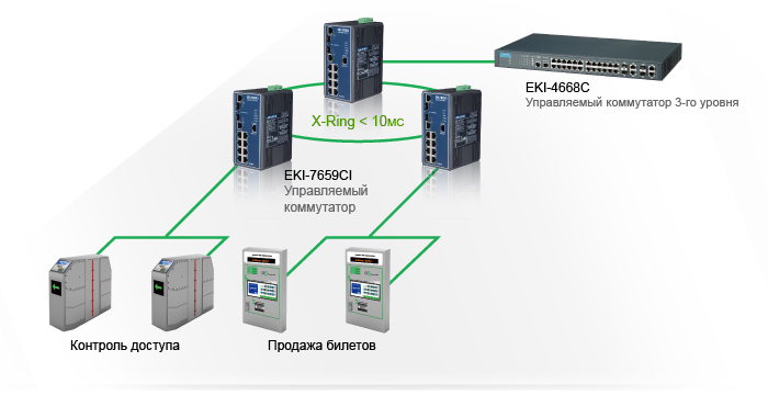 На современных железнодорожных станциях автоматическая система обслуживания пассажиров (AFC) включает в себя аппараты по продаже билетов (TVM), аппараты для проверки билетов (TCM) и систему контроля доступа, которая требует наличия Ethernet коммутаторов 2-го и 3-го уровня для обеспечения быстрой, надежной и безопасной работы сети в целом.