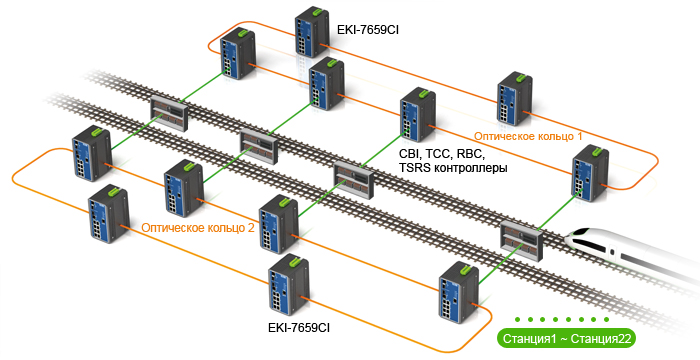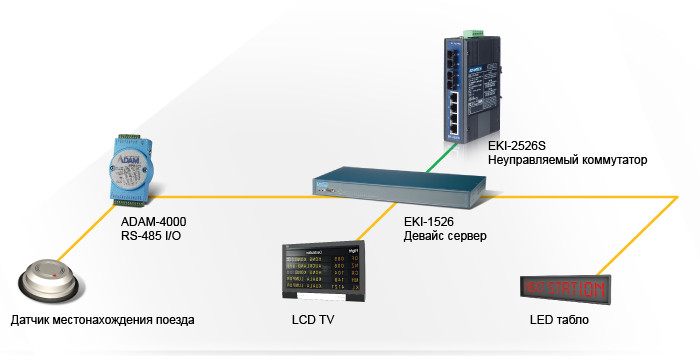 Промышленные Ethernet коммутаторы и последовательные девайс-серверы компании Advantech являясь ядром сети позволяют на железнодорожных станциях контролировать и осуществлять передачу информации в реальном времени из центра управления на мониторы системы. Передаваемая информация может включать различное информацию о прибытии и отправлении поездов, новости, рекламу, информацию в случае чрезвычайных ситуаций , что повышает эффективность и безопасность движения пассажиропотоков.