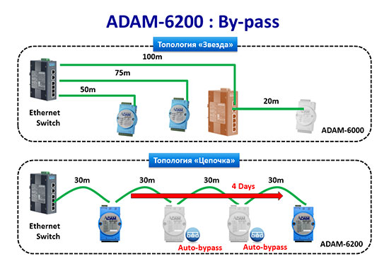 Многие проектировщики относятся к звездной Ethernet топологии, как к неизбежному злу, плетя паутины из витых пар вдоль протяженных объектов. Еще одна фишка, в этот раз в серии 6200, позволяет по новому взглянуть на проблему. Advantech взял, да и встроил 2-х портовый hub в каждый свой модуль, тем самым позволив их просто соединять цепочкой.