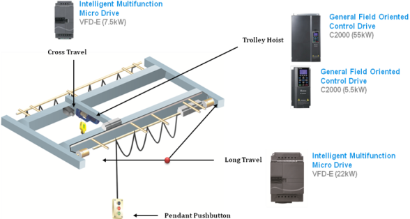 Кран-балка один из наиболее распространенных видов мостовых кранов. Softstart UK искала экономичную и надежную систему для подобных применений. DELTA предложила свое решение на базе векторного ПЧ «C2000» в качестве привода лебедки, многофункциональных ПЧ серии «E» обеспечивающих линейные перемещения крана и рекуператора «REG2000» вместо тормозных резисторов.