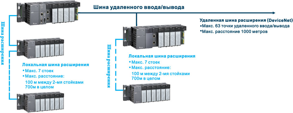 • гибкость компоновки и расширения , до 100м. (2 км. через оптику) между стойками ПЛК