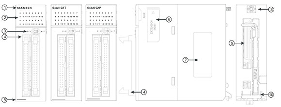 Модули ввода/вывод высокой плотности. 1-шифр модуля, 2- светодиодная индикация каналов,3-переключатель индикации первые/вторые 32 канала, 4 разъем для подключения готового кабеля с клеммником, 5-описание/спецификация входов-выходов, 6- порт для обновления firmware, 7-табличка с названием, 8 - крепежные винты, 9 - соединитель с интерфейсом ПЛК/УСО, 10 - крепление