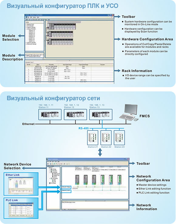 • Визуальная конфигурация ПЛК, удаленного УСО и сети.