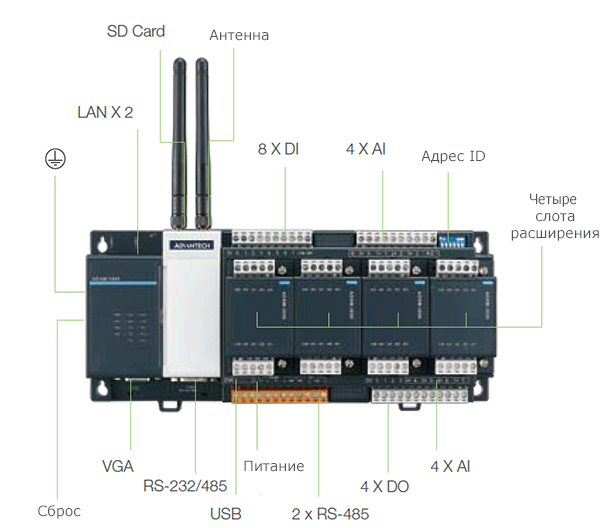 Поэтому почти не требуется дополнительного места, если понадобится добавить дополнительные модули ввода/вывода, беспроводные устройства, GPRS. Этот модульный подход позволяет инженерам быстро и легко изменять функциональность ADAM-3600 без необходимости покупать новый блок, либо беспокоится о наличии свободного места в шкафу.