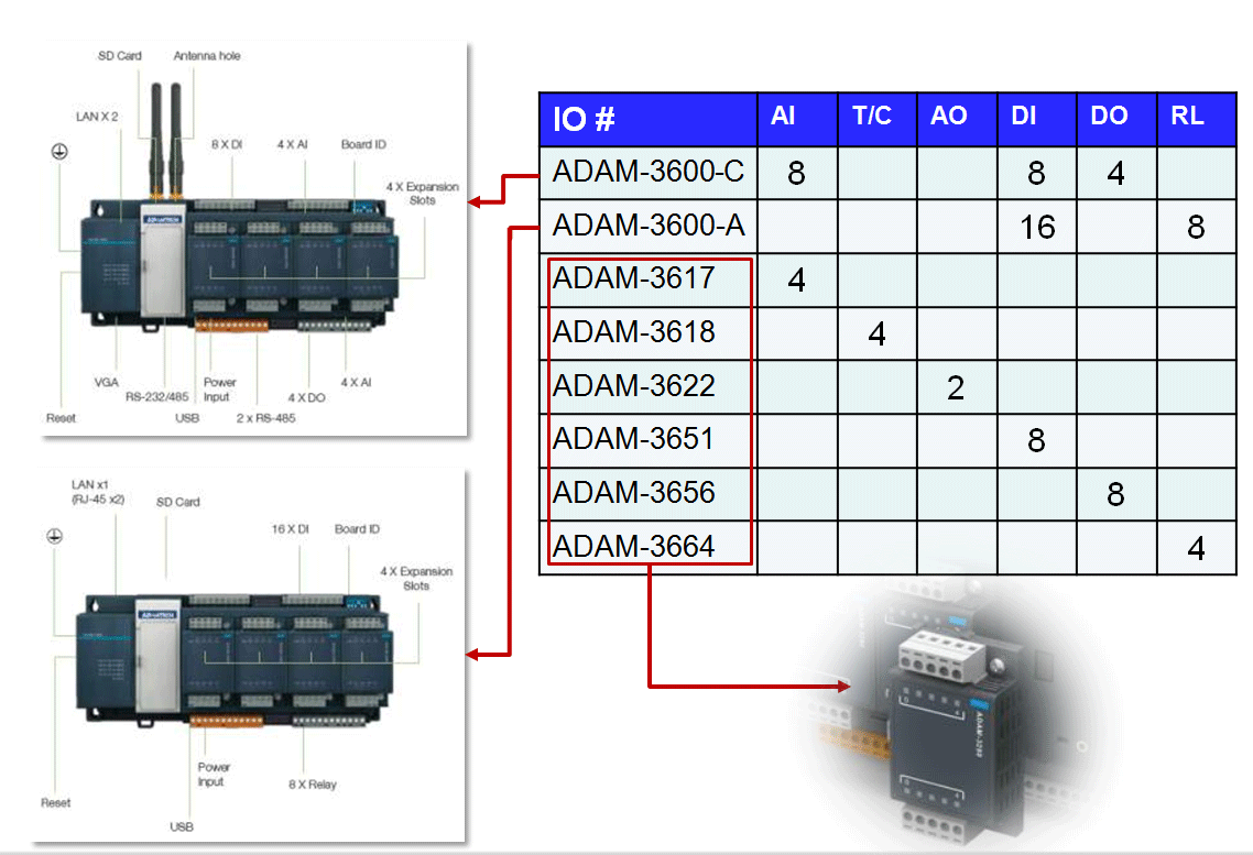 Семейство ADAM-3600 состоит из ПЛК/УСПД с шифром ADAM-3600C и чистого УСПД ADAM-3600A , различающиеся количеством и типом входных и выходных сигналов на борту, центральным процессором, наличием беспроводных функций. Существенным отличием является и тот факт, что ADAM-3600C может программироваться и являться инициатором обмена, в то-же время ADAM-3600A представляет из себя УСПД или RTU, предоставляющее данные для ADAM-3600C и для других мастеров по запоросу.