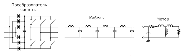 Упрощенная модель кабеля , преобразователя частоты и двигателя представлена ниже.