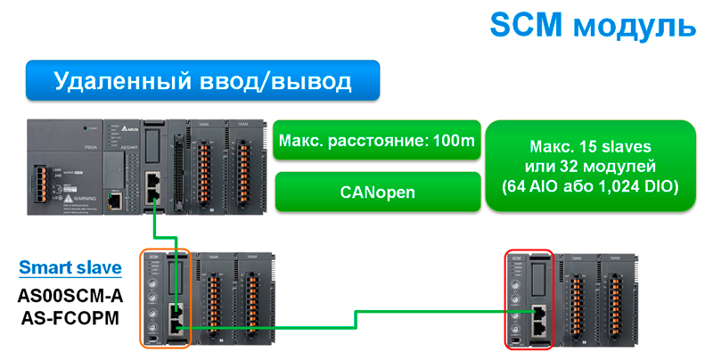Если у вас протяженная линия или станок, можно сэкономить на кабельной продукции и ее монтаже,применив удаленное УСО. Для этого нам понадобится всего навсего один, так называемый SCM модуль, так как корзин, как вы помните в этом контроллере нет.