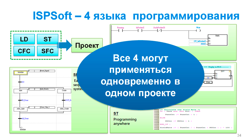 Как уже упоминалось, для программирования одновременно использовать 4 технологических языка стандарта МЭК-61131. Кто-то мыслит электрическими схемами, кто-то блок схемами алгоритмов, кому-то понятнее контакты и катушки, а кто-то просто хочет писать на языке программирования высокого уровня. Теперь все 4 могут одновременно работать над одним проектом.