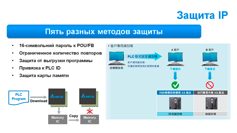 В-пятых можно защитить карту памяти - она будет читаться только на нужном ПЛК и через нее невозможно будет переписать программу на другой ПЛК.