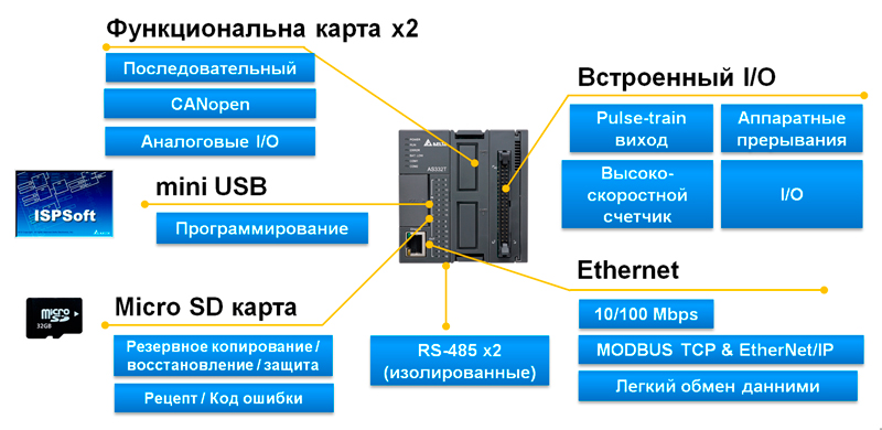 На борту процессора уже сразу есть все необходимое: встроенный ввод-вывод, поддерживающий позиционирование по 14-ти осям,высокоскоростные счетчики, аппаратные прерывания, микро SD карта, с рецептами и данными, порт Ethernet, который поддерживает MODBUS TCP и EtherNet/IP. В специальные слоты процессора можно установить функциональные карты, которые могут быть следующих типов: