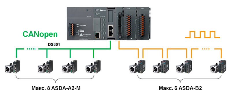 Так, он умеет работать сразу с 14-тью осями, с 8-мью по шине CANopen и еще с 6-тью с помощью обычных импульсных выходов.