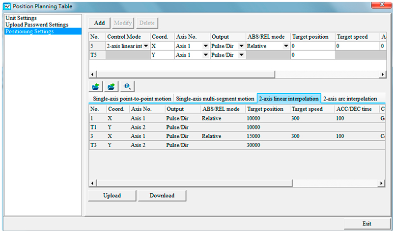Помимо традиционного импульсного позиционирования из основной программы, предоставляется удобный режим высокоскоростного позиционирования по простой таблице позиций, так называемый HSPO. В этой таблице все понятно и без документации: