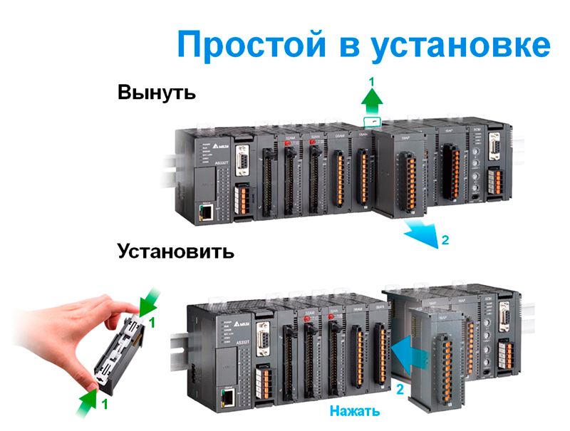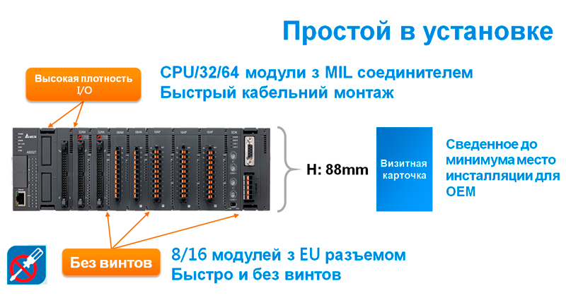 Младшие ПЛК Delta не имеют традиционной “корзины” или пассивной объединяющей платы. Такая конструкция обладает рядом преимуществ. Во-первых уходит одно лишнее разъемное соединение и один элемент системы, что по теоретически повышает надежность. Во-вторых это просто дешевле.