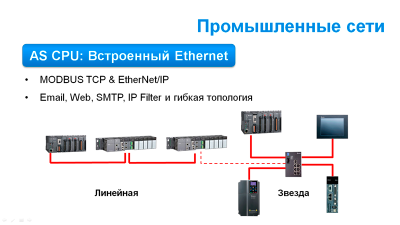 Благодаря встроенному Ethernet и поддержке EtherNet/IP и MODBUS TCP контроллер легко интегрируется с оборудованием других компаний и производства самой Delta Electronics. Поддерживаются топологии звезда и линейная.