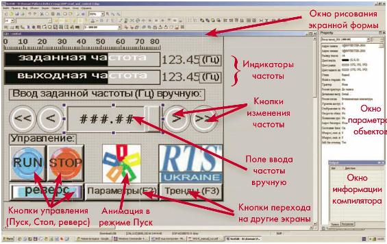 Графические объекты – кнопки, индикаторы, поля ввода и т. п., вводятся на экранную форму мышью из банка графических объектов. Разместив объекты на экране, и настроив их свойства (цвет, прозрачность, размер, тип шрифта), остается только настроить их поведение – то есть, заставить конкретные индикаторы читать информацию из указанных регистров преобразователя частоты, а поле ввода заданной частоты и кнопки Пуск, Стоп и Реверс – давать команды в соответствующие регистры частотника.
