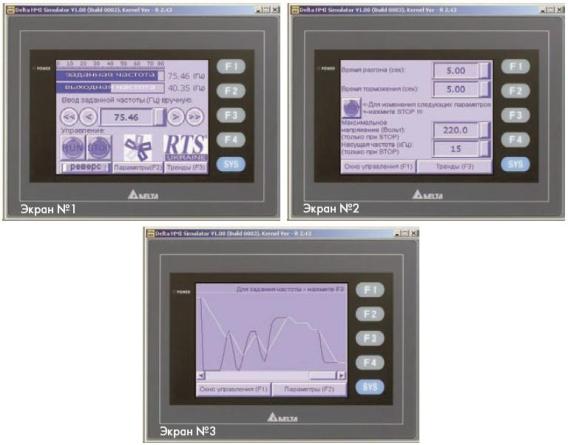 Кроме того, есть еще более интересный режим – симуляция On-Line – то есть, работа с подключением компьютера к реальному оборудованию (в нашем примере – к ПЧ). То есть, компьютер на котором стоит «ScreenEditor», имитирует собой поведение операторской панели. Это позволяет окончательно отладить программу, до загрузки ее в реальную операторскую панель. Внешний вид всех трех созданных окон в режиме симуляции On-Line приведен на рис. 3.
