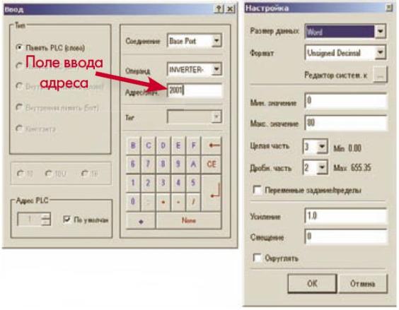 Требуемый нам регистр (заданная частота) имеет адрес 2001Н, и этот адрес мы задаем в поле адреса в окне настройки свойств графического поля ввода частоты – см. рисунок.